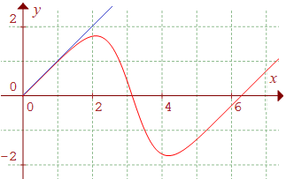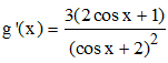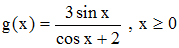 4°) Au delà de l'intervalle (x ≥ 2π/3), la périodicité de g permet de conclure que sur [0,+∞[ la courbe (Cg) se situe "au-dessous" de sa tangente en x = 0 d'équation y = x. On peut donc écrire que pour tout x ≥ 0, on a 3sin x/(cos x + 2) ≤ x.