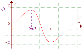 Sur l'intervalle [0,2π/3], on a sin x ≥ 0 (nul en 0), cos x + 2 > 0, cos x - 1 ≤ 0 (nul en 0) : on a donc g''(x) < 0 sauf en x = 0 où g" s'annule : la courbe est donc concave sur l'intervalle considéré : elle reste en dessous de sa tangente à l'origine en atteignant l'ordonnée maximale √3 en x = 2π/3 :
