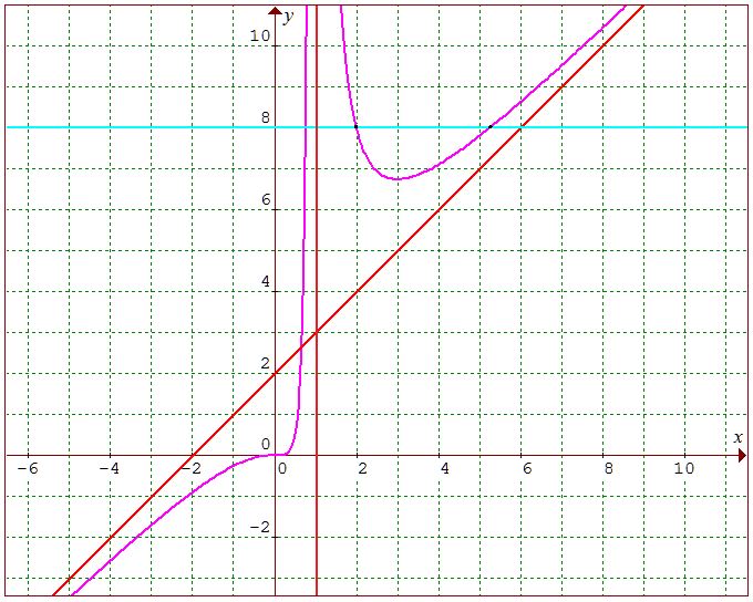 8°/ La courbe (C) rencontre son asymptote d1 lorsque f(x) = x + 2. En utilisant 5° b/, l'équation f(x) = x + 2 est équivalente à 3/(x - 1) + 1/(x - 1)2 = 0, c'est à dire 3(x - 1) + 1 = 0, dont on tire x = 2/3.
