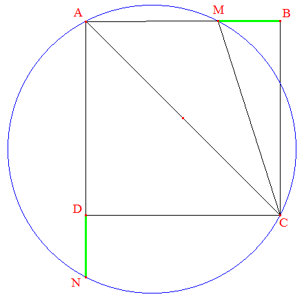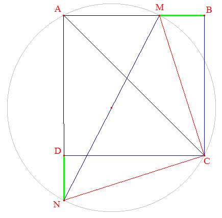 • ABCD étant un carré, ^MAN est droit; [MN] est donc un diamètre et C étant sur le cercle, ^MCN est également droit.