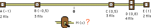 ➔ Sur le schéma, on a appelé A, B, C, D et E les prises et M le disjoncteur. Les nombres indiquent la position algébrique des prises par rapport au milieu de la gaine pris comme origine. On a donc pris 4 m comme unité.